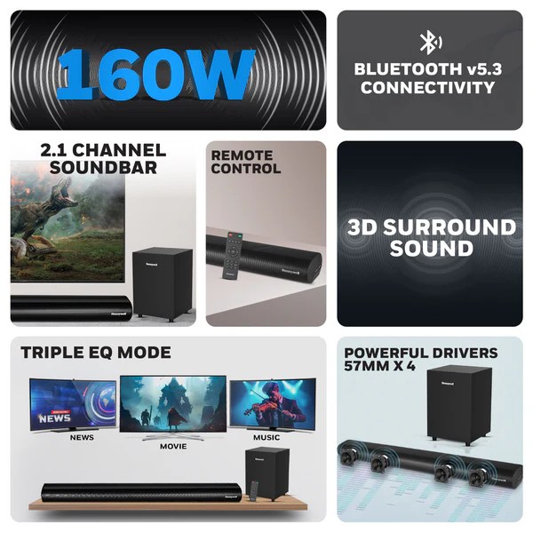 Honeywell Trueno U2000 Soundbar – New – Honeywell Trueno U2000 Soundbar – New | Specs, Features, and FAQs Highlights: 160W RMS Output creates dynamic Sound Experience – 57mmx4 Soundbar Drivers offers an immersive audio & gaming experience – Relish theatre like experience with elegant and powerful down firing subwoofer with 133.3mm drivers – Enjoy High-Quality Crystal-Clear Sound with 2.1 channel sound – Stream & enjoy all your audio wirelessly within 10m range via Bluetooth V5.3+EDR from any Smart Phone, PC, Tablet and TV – 5 Play Modes: Enjoy distortion free content through Bluetooth, 3.5mm AUX, USB, Optical Input & HDMI/ARC cable – Access your content with user friendly remote control – Black glossy finish with premium minimalist design Identifiers: SKU HC000258/AUD/SB/U2000/BLK | GTIN 8906120132718 Why it stands out: premium build, reliable performance, and easy setup. Optimized for clear sound, durability, and everyday convenience. FAQs: Q: What is included in the box? A: Device, charging cable, and quick start guide. Q: Is there a warranty? A: Yes, manufacturer warranty applies. Q: Who is this for? A: Great for home, office, and travel use. Best for: Honeywell Trueno U2000 Soundbar – New users seeking dependable quality.