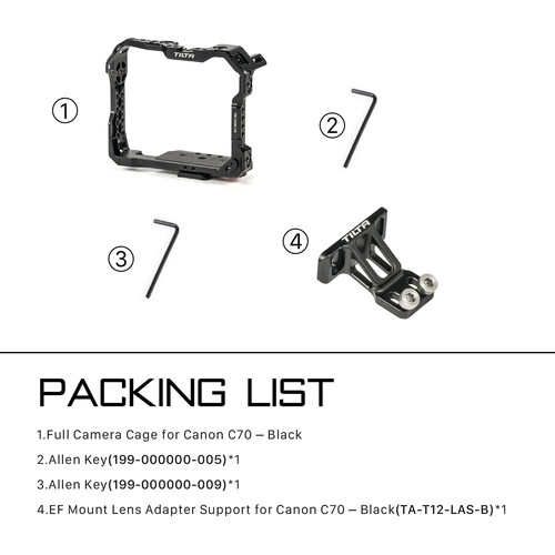 Protect your Canon C70 camera and add a variety of accessories with this black Full Camera Cage from Tilta. The durable aluminum cage is designed to fit the Canon C70, and the camera mounts onto the cage using a 1/4″-20 anti-twist screw. A lens adapter support is included to mount onto the front of the cage to provide support for the Tilta RF-to-EF-mount lens adapter.